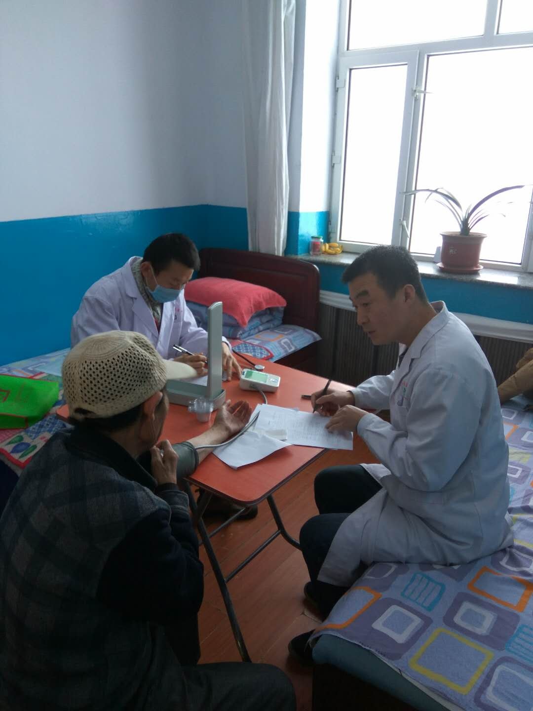 12月4日至5日,便民社区卫生服务中心10名医护人员携带心电图机、B超机、验尿器等设备,来到养老中心为特护区老人进行体检。体检内容包括:健康状况评估、内外科检查、血压测量、心电图、血常规、肝肾功能、血脂血糖等生化检查,特护区大多是腿脚行动不便的老人,医护人员到老人房间逐一巡诊,细致地为每一位老人进行全方位的健康检查。